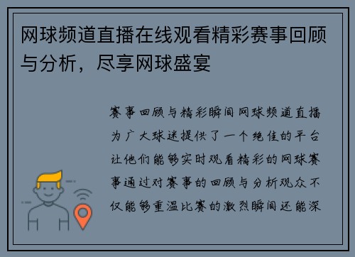 网球频道直播在线观看精彩赛事回顾与分析,尽享网球盛宴