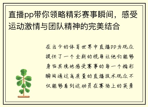 直播pp带你领略精彩赛事瞬间,感受运动激情与团队精神的完美结合